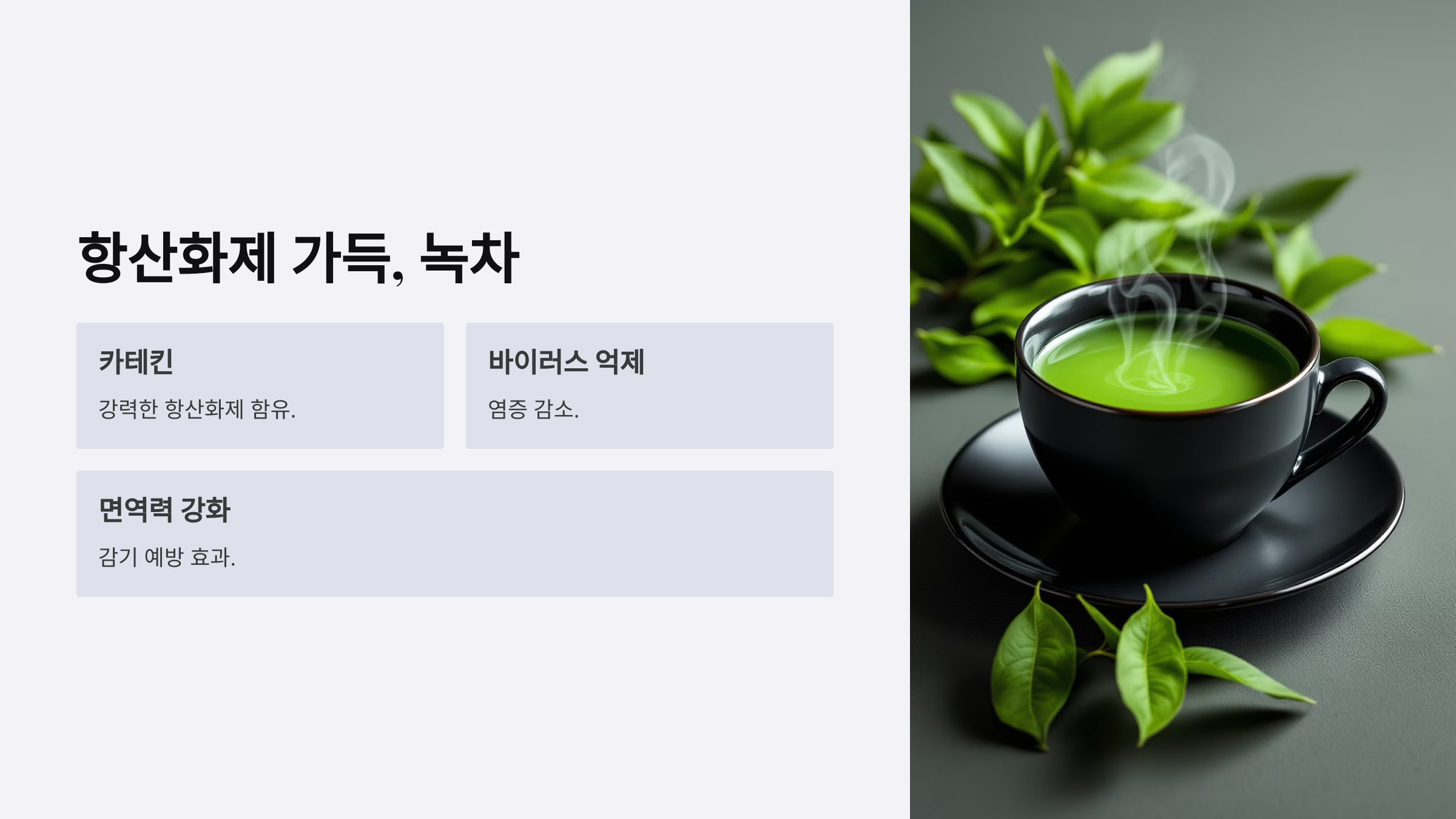 녹차에는 카테킨이라는 강력한 항산화제가 들어있습니다. 이 성분은 바이러스의 활동을 억제하고 염증을 줄이는 데 도움을 줍니다. 하루에 한두 잔의 녹차를 마시는 것만으로도 면역력을 높이고 감기 예방에 효과를 볼 수 있어요.