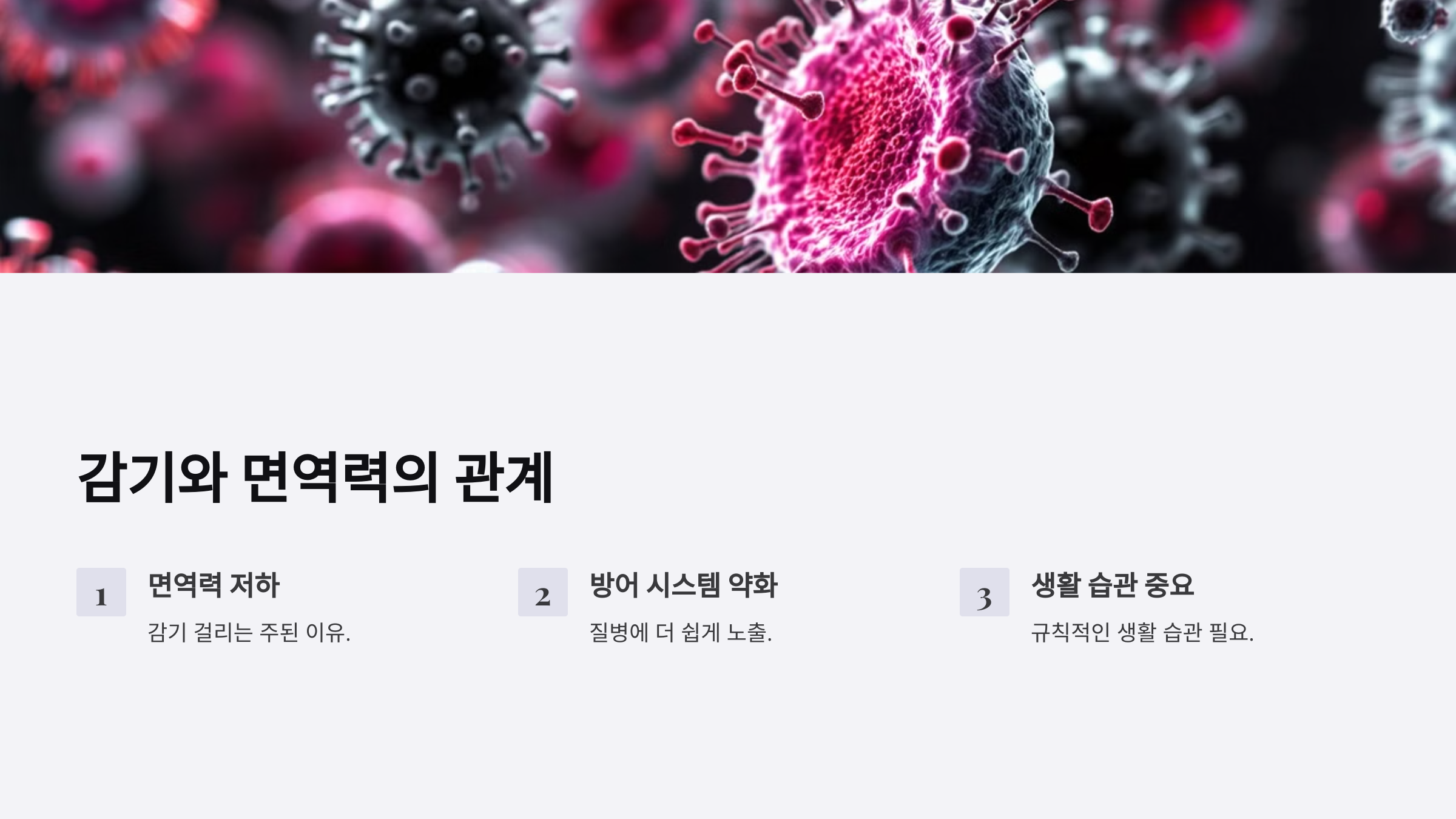 감기에 걸리는 주된 이유는 바로 면역력 저하입니다. 면역력은 우리 몸이 바이러스와 박테리아로부터 자신을 보호하는 방어 시스템인데요. 이 시스템이 약해지면 감기 같은 질병에 더 쉽게 노출되게 됩니다. 특히 스트레스, 과로, 불규칙한 식습관은 면역력을 크게 떨어뜨릴 수 있어요. 건강을 지키기 위해서는 규칙적인 생활 습관과 면역력을 높이는 음식 섭취가 중요합니다.