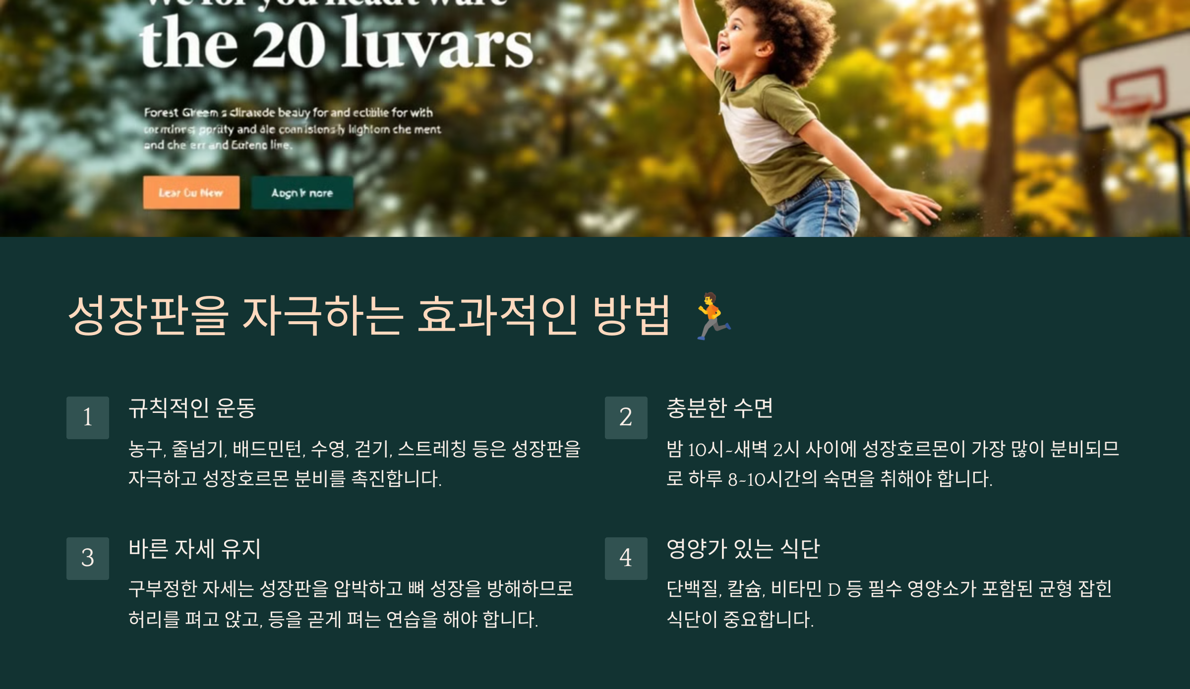 아이의 키 성장은 성장판이 닫히기 전에 얼마나 자극하고 관리하느냐에 따라 크게 달라질 수 있습니다. 오늘은 성장판을 자극하는 효과적인 방법과 이를 뒷받침하는 영양제 정보, 그리고 실제 키 성장 성공 사례를 소개할게요. 🏀 아이의 성장 잠재력을 극대화하고 싶다면 꼭 끝까지 읽어보세요!