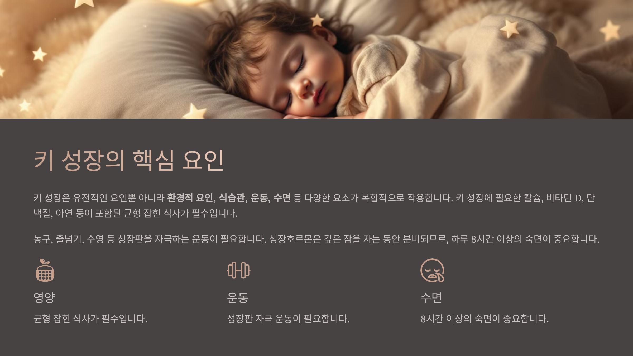 키 성장은 유전적인 요인뿐 아니라 환경적 요인, 식습관, 운동, 수면 등 다양한 요소가 복합적으로 작용합니다.